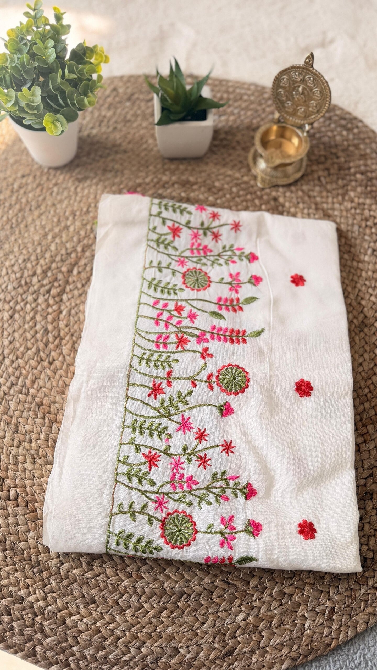 Set on a soft off-white cotton base, the saree features a stunning embroidered border with vibrant pink flowers and green vine patterns, giving it a graceful and feminine appeal. The fine embroidery adds texture and depth, making it perfect for both festive occasions and refined everyday wear.