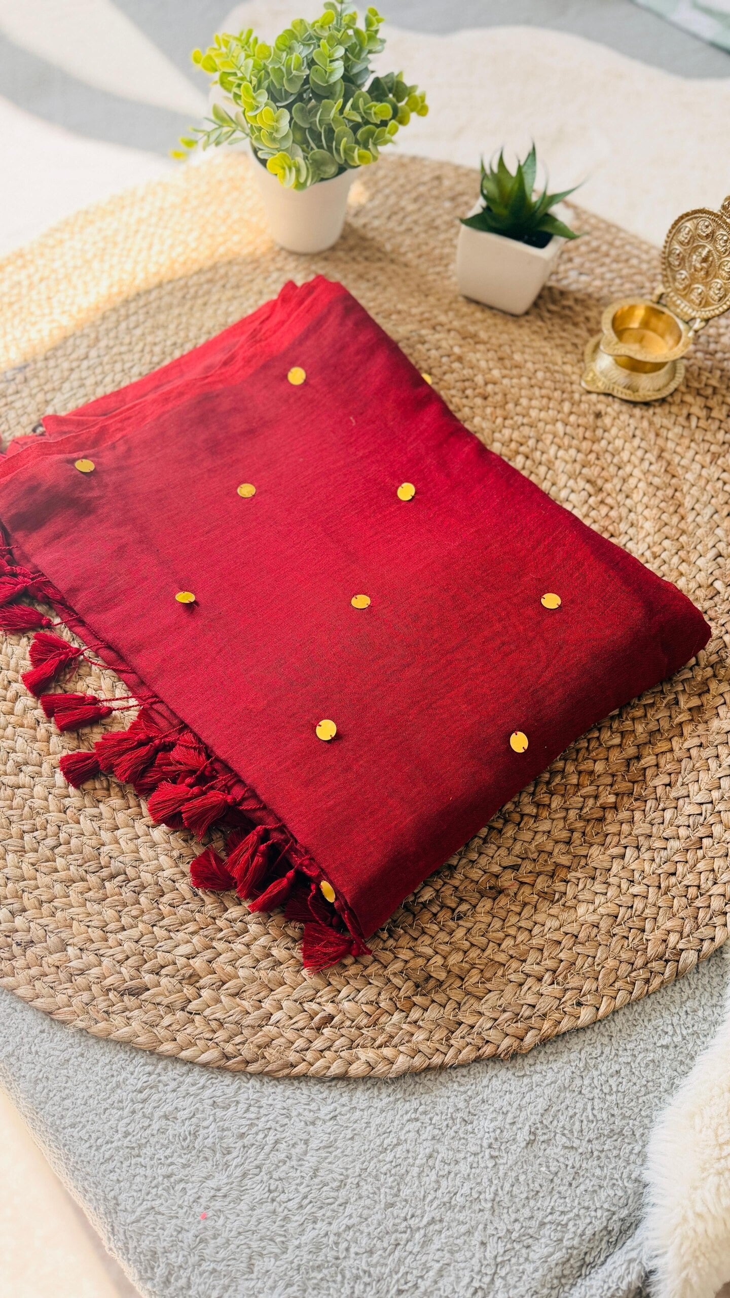 Crafted from soft, breathable cotton, this saree features a deep red base adorned with delicate gold polka dot accents, adding a subtle festive shimmer. The look is beautifully completed with a stylish tassel pallu, enhancing its traditional yet contemporary appeal.